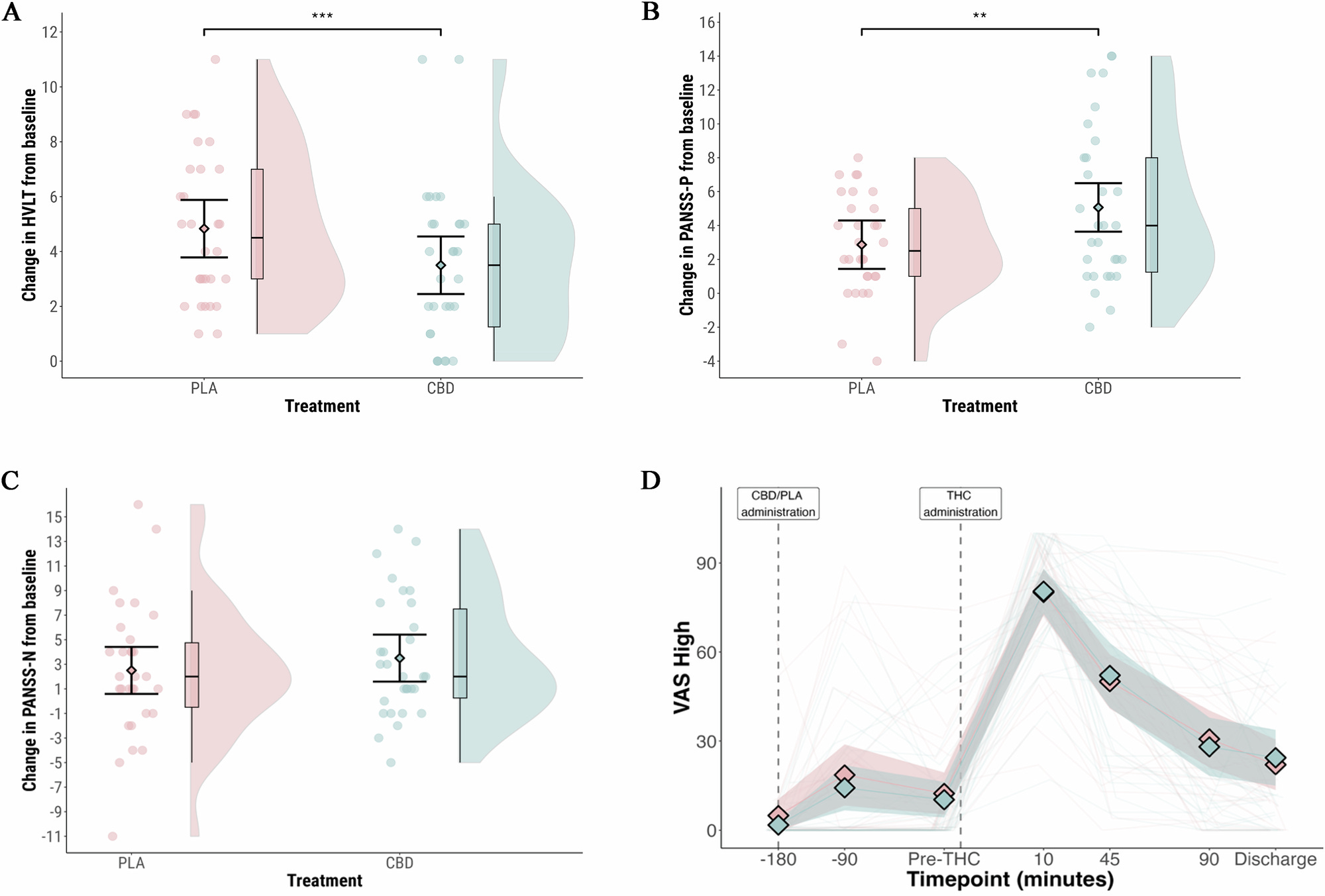 In the placebo experiments, THC resulted in PANSS scores (a standard measure of psychotic symptoms) increasing by an average of 3 points. Pre-treatment with CBD resulted in worse psychotic symptoms, an average increase of 5 points. Seven participants experienced a large increase in psychotic symptoms (>9 points) - all of these were after pre-treatment with CBD. Performance on a memory test, Hopkins Verbal Learning Test-Revised, was also worse after pre-treatment with CBD. Interestingly, CBD did not affect self-rated level of intoxication.