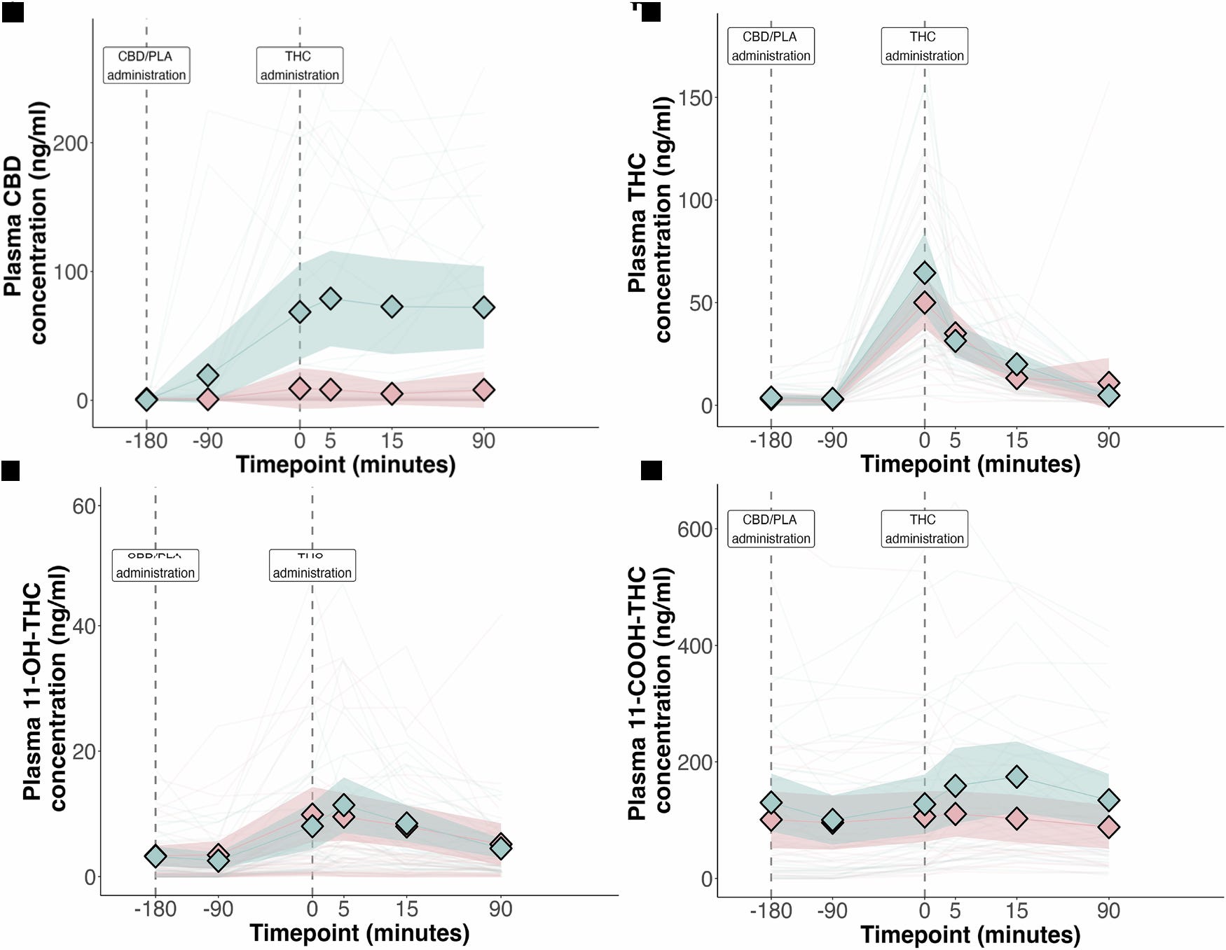 When I first saw these results, I assumed the CBD and placebo groups had been mislabelled during the analysis. It was no mistake though - the CBD and THC blood levels were taken at regular intervals so we can be sure which was which. We can also see the pre-treatment with CBD did not effect THC levels, or its active metabolites (shown below) so it wasn’t a simple case of THC concentrations driving the differences.
